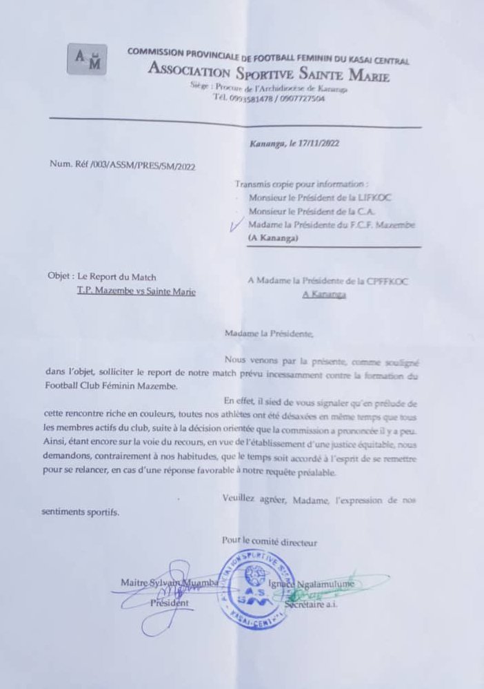 Dans une lettre datée de ce vendredi 18 novembre 2022,dont une copie est parvenue à notre rédaction,les saintes de bena mukangala se disent être bouleversées moralement suite à la suspension de 24 mois qui a frappé leur secrétaire sportif,raison pour laquelle,elles sollicitent un décalage de ce choc très attendu par le public sportif kanangais.