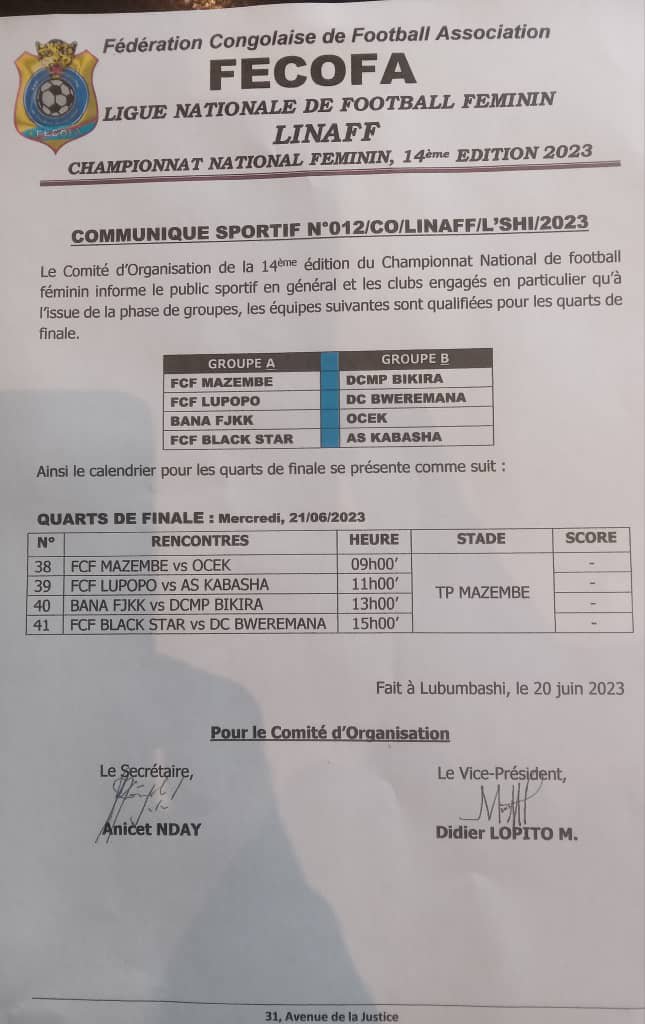 À l’issue de ce classement général après la phase des groupes de la ligue nationale du football féminin, LINAFF, les affiches des quarts de finale se présentent de la manière suivante ce mercredi 21 juin 2023 au Stade TP Mazembe de Lubumbashi.