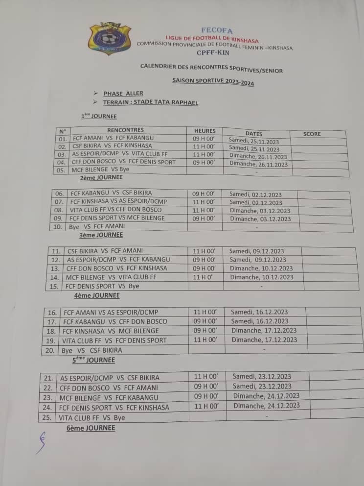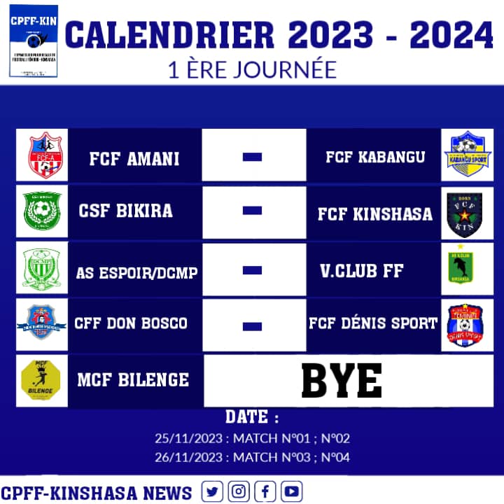Le calendrier rendu public le vendredi 10-novembre-2023 indique chez les seniors en ouverture le 25-novembre au stade tata Raphaël, le quadruple champion kinois, le FCF AMANI qui accueillera les novices de KABANGU SPORT à 09h00 tandis que les vierges du CSF BIKIRA joueront les cossyphes du FCF KINSHASA à 11h00 et pour compléter les affiches, le 26-novembre le CFF DON BOSCO qui va jouer DENIS SPORT FCF à 09h00 puis le premier derby kinois en match officiel, DCMP-V.CLUB à 11h00.