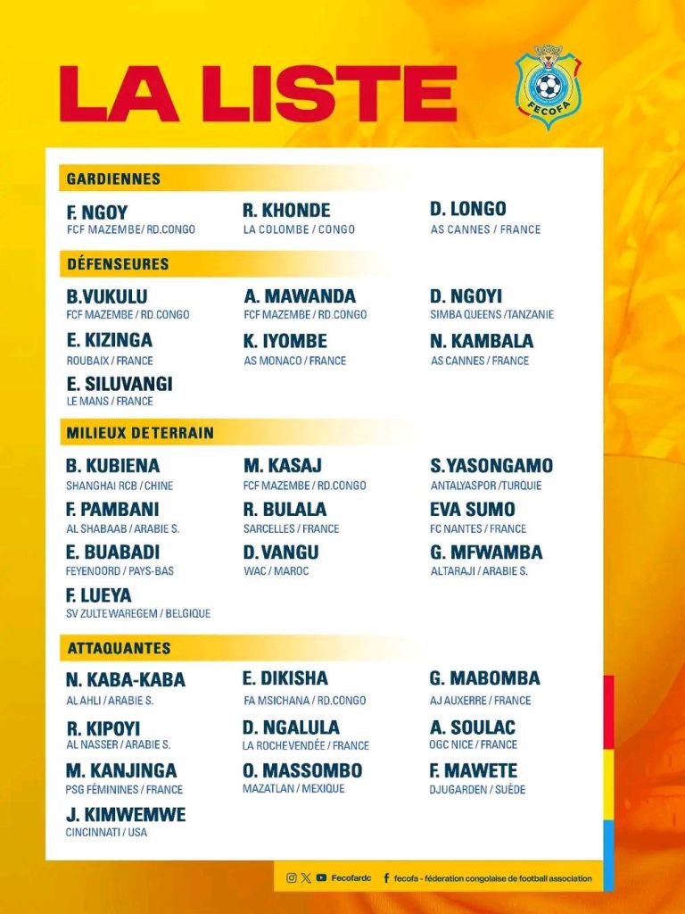 La ligne d’attaque sera composée de Naomie KABAKABA d’Al AHLI/Arabie Saoudite, Esther DIKISHA de FA MSICHANA, Gloria MABOMBA d’Auxerre/France, Ruth KIPOYI d’AL NASSR/Arabie Saoudite, Déborah NGALULA de La Roche Vendée/France, Anna SOULAC de l’OGC Nice/France, Merveille KANJINGA de PSG Féminines/France, Olga MASSOMBA de Mazaltan/Mexique, Flavine MAWETE de Djugarden/Suède ainsi que Joy KIMWEMWE de CINCINNATI/USA.