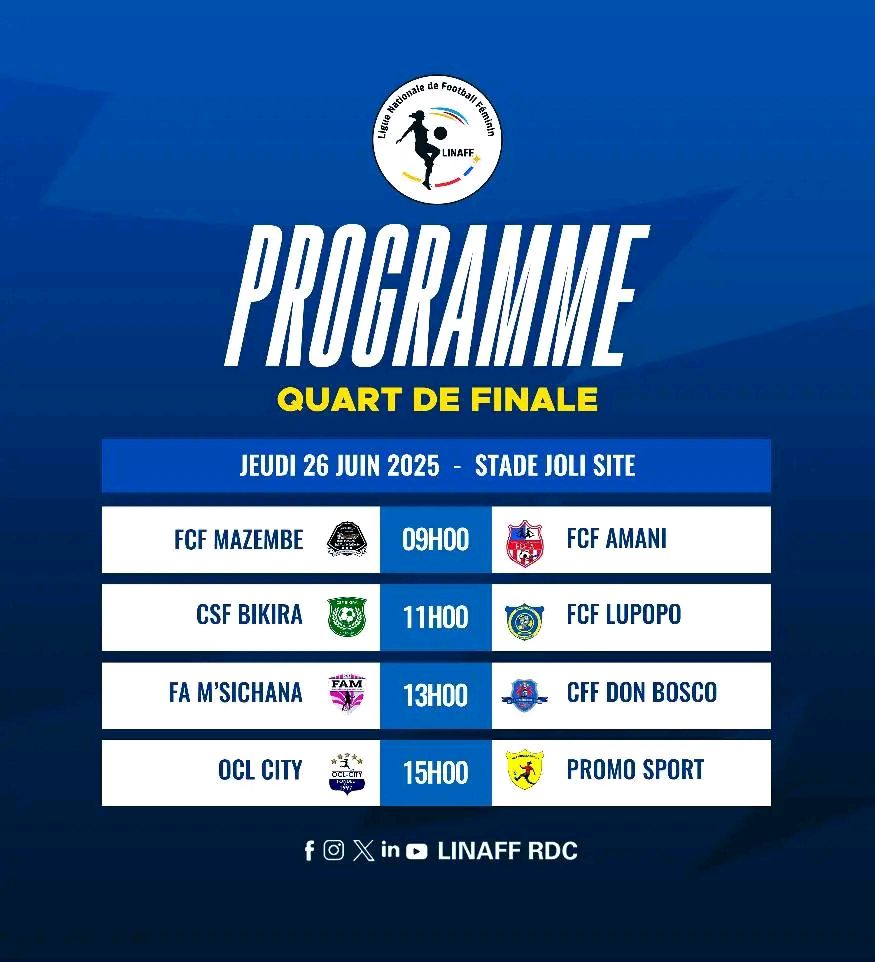 Ce jeudi 26 juin 2025, la pelouse du stade Gaëtan KAKUDJI de Jolie Site sera le théâtre des quatre grands rendez-vous du football féminin, les affiches des quarts de finale de la 16e Édition du championnat national de la version féminine du football en RDC.